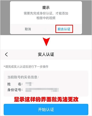 4、点击“上传相册视频”后会弹出一个窗口,此时点击“前去认证”会打开新界面。关键在于:若该界面与下方图示完全一致,则无法修改;若不一致,直接输入需更改的实名信息并点击确定即可。